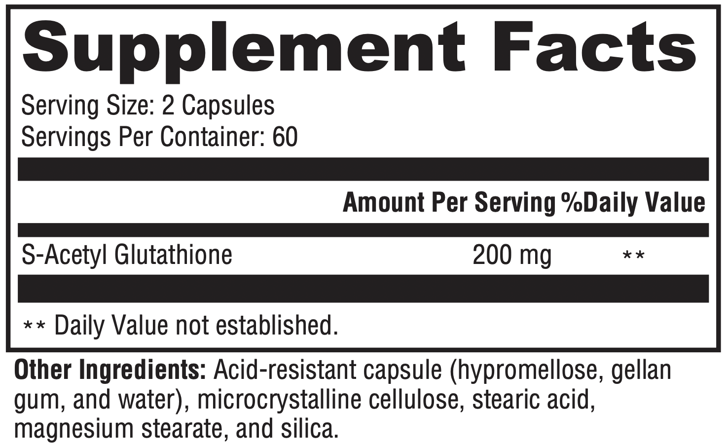 S-Acetyl Glutathione is an acetylated form of glutathione. This form is well-absorbed, highly bioavailable, and more stable throughout the digestive tract than other forms on the market.